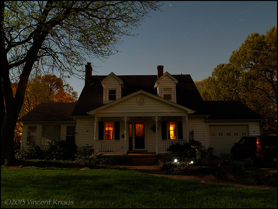 Next I thought I’d use the house as my subject. Again, a three minute exposure but the house is a bit backlit as it faces northeast. The moonlight created some shadows on the grass and lit up the trees behind the house. I like being able to make exposures longer than one minute with a point and shoot. I think I’ll be out just having fun with this camera quite often!
